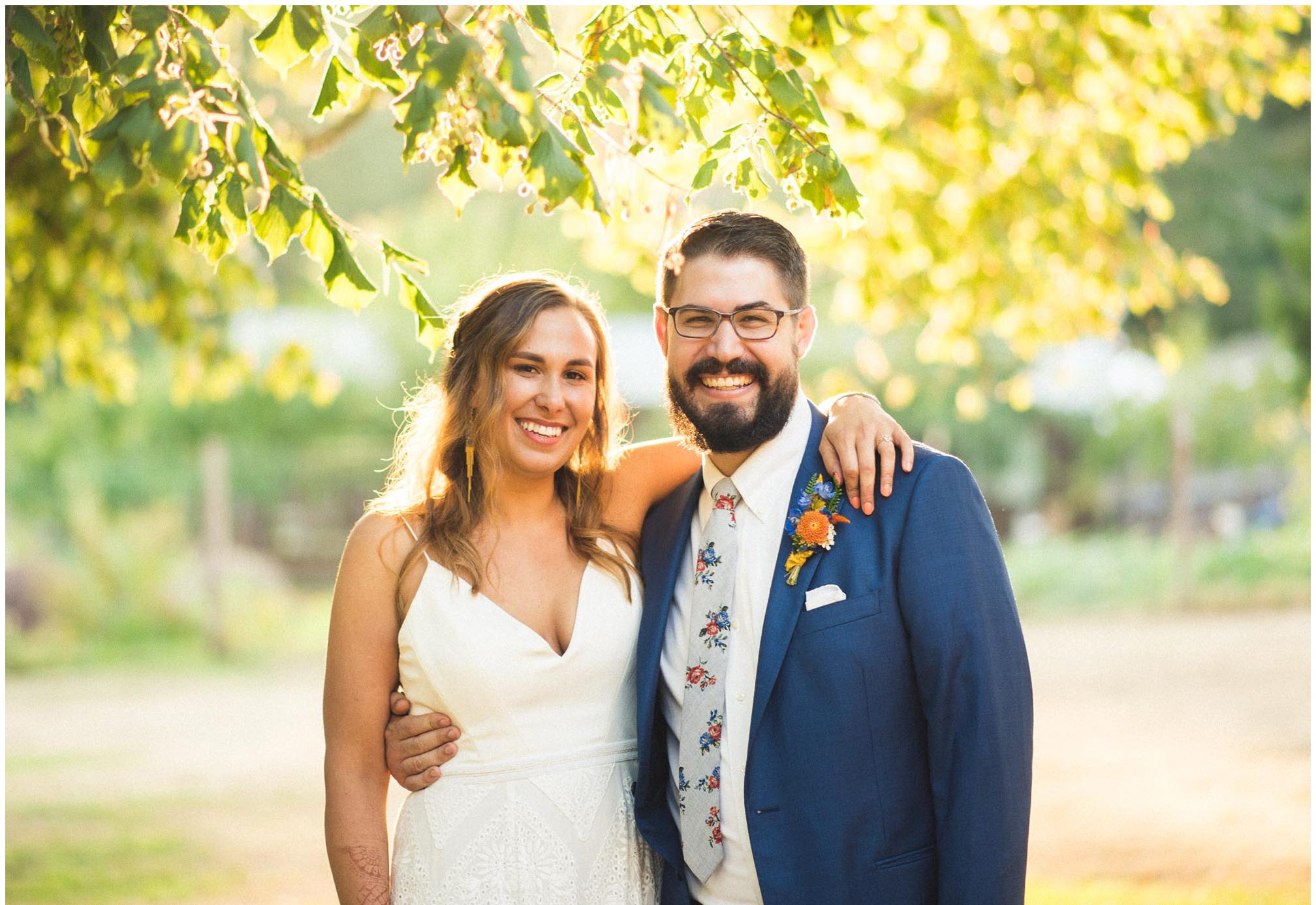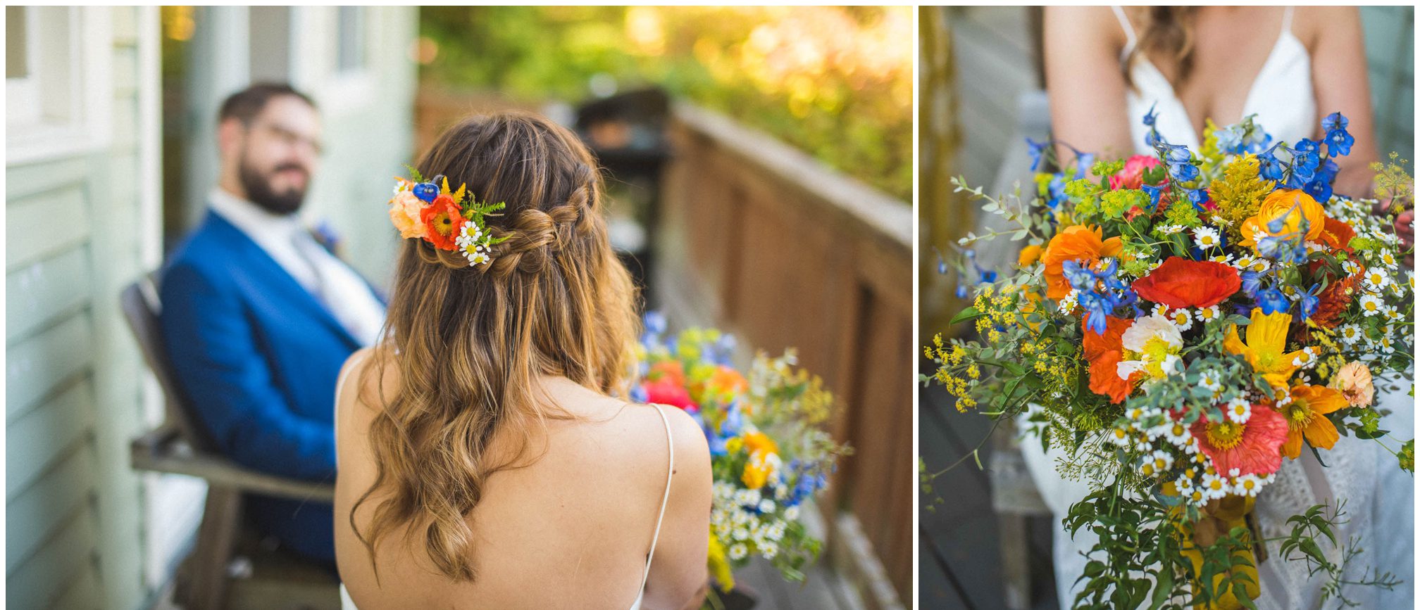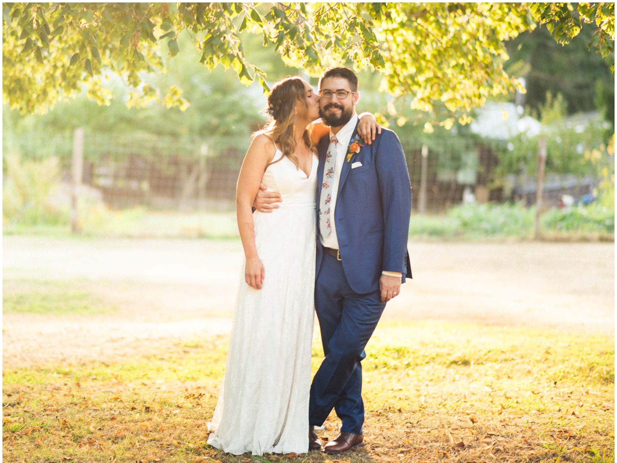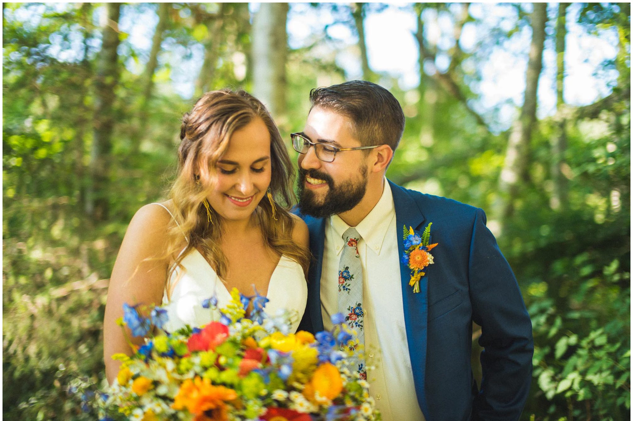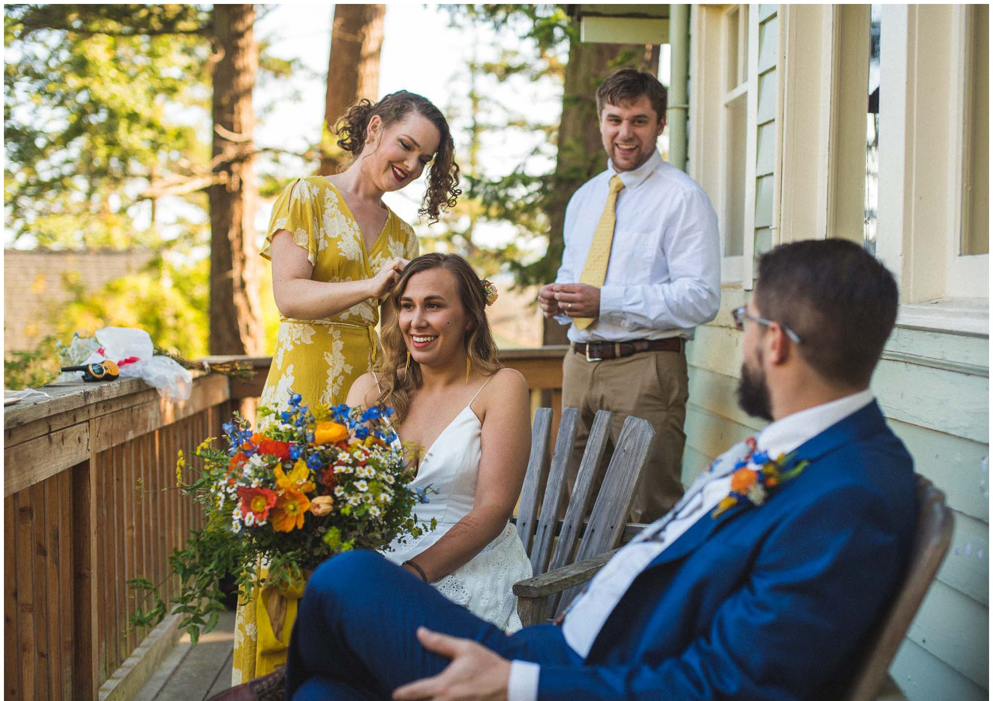 What amazes me most looking back on our wedding is how, even though we made a 3-night weekend trip out of it, it absolutely flew by. It was a whirlwind of the very best kind. I’ll always remember the raucous glee of the guests the night before the wedding, as some of our dearest friends and family met one another for the first time, and I assembled our wedding cake while everyone heckled me like I was on a cooking show and stole cake scraps. I’ll remember how much trouble I had falling asleep that night because I was so worried about all of the details I was forgetting, Jesse doing everything he could to soothe me to sleep, and then then incredible calm and sense of total happiness that came over me when I put on my dress and realized I was GETTING MARRIED to a person I love deeply, and the details weren’t that important. I’ll think back with amazement and gratitude about the different ways our friends and family pitched in cheerfully to make the whole thing happen — people setting tables, stringing lights, assembling the incredible wedding arch that my dad made, shredding pork with their hands, putting out snacks. My brother and sister-in-law/BFF Josh and Molly accomplishing a superhuman amount of work and never complaining once. I’ll remember how beautifully our friend Gigi played the piano as Jesse and I walked together to the ceremony spot, and how my sister Emily’s reading of the poem “For What Binds Us” by Jane Hirshfield moved me and felt so true to the love Jesse and I were celebrating. I’ll remember the sincerity of our vows and wiping tears from Jesse’s cheeks with the handkerchief I hid in my bouquet. The next day, a big group of us kayaked along the north shore of Orcas and it was exhilarating — the weather cooperated and the water wasn’t too choppy, and we saw harbor seals and birds and breathed the salt air. It was all over way too soon, and I remember crying happy and sad tears as we took one last look at the water from our ceremony spot before we caught a ferry home. For me, it was a weekend of pure magic. – Kiley